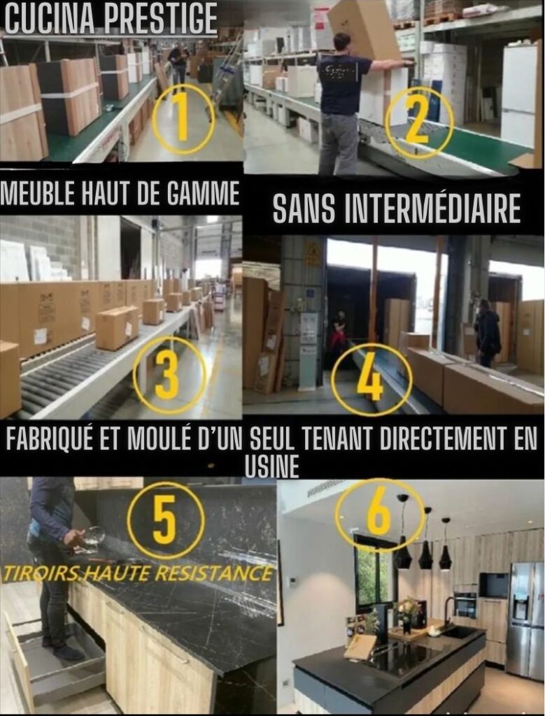 Chez Cucina Prestige, nous croyons que chacun mérite une cuisine d’exception. C’est pourquoi nous proposons jusqu’à 70% de remise sur nos cuisines. En adoptant une politique de faible marge et en supprimant les intermédiaires grâce à un accès direct à l’usine, nous réduisons les coûts tout en garantissant une qualité irréprochable.